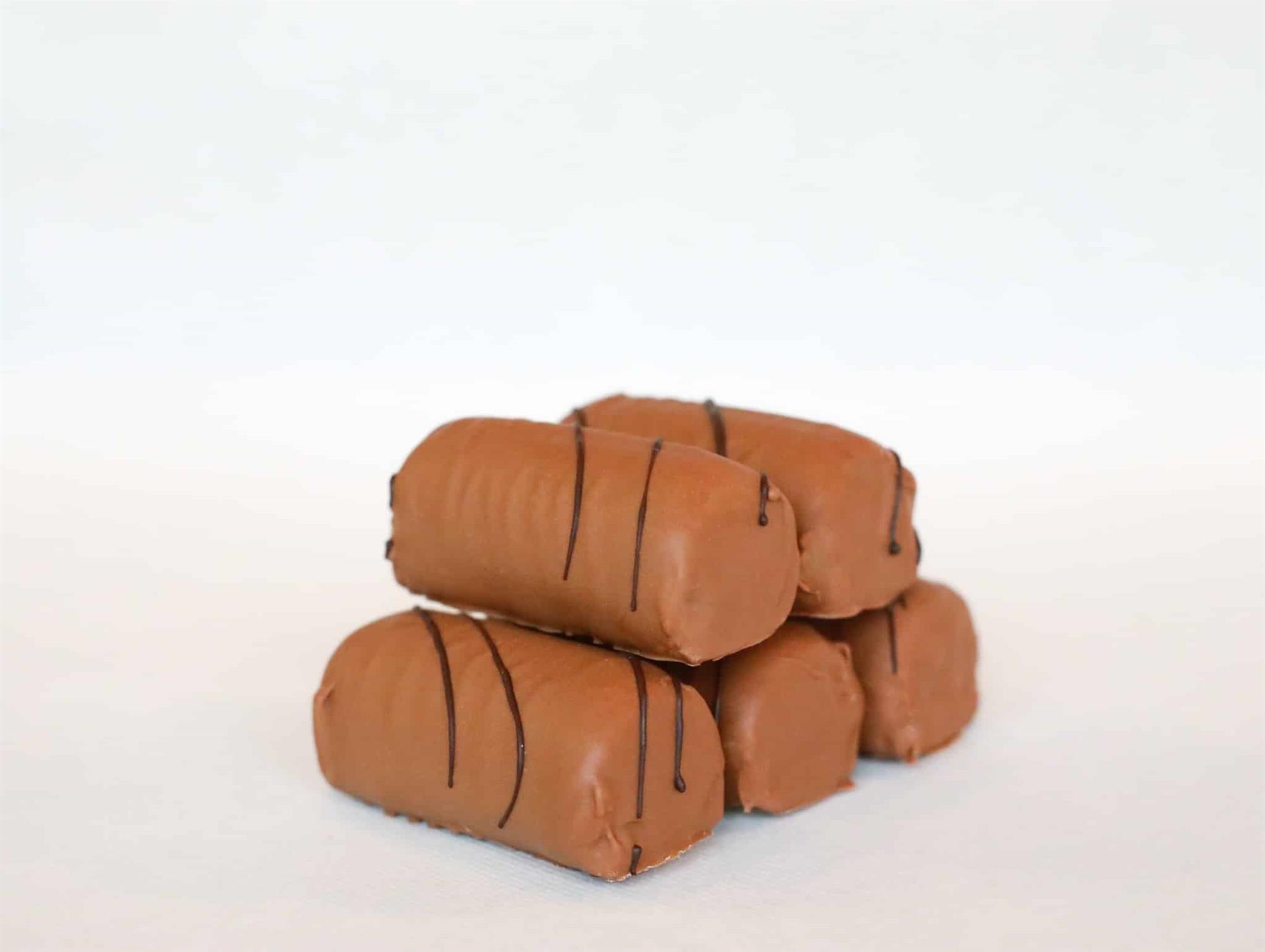 Luksusudgave af vores originale træstamme. Fyldet i træstammen er det samme som fyldet fra Danmarks bedste romkugle. Den er overtrukket med smørcreme, marcipan og karamelchokolade og til sidst pyntet med mørk chokolade. Sælges i pakker af 10 stk.