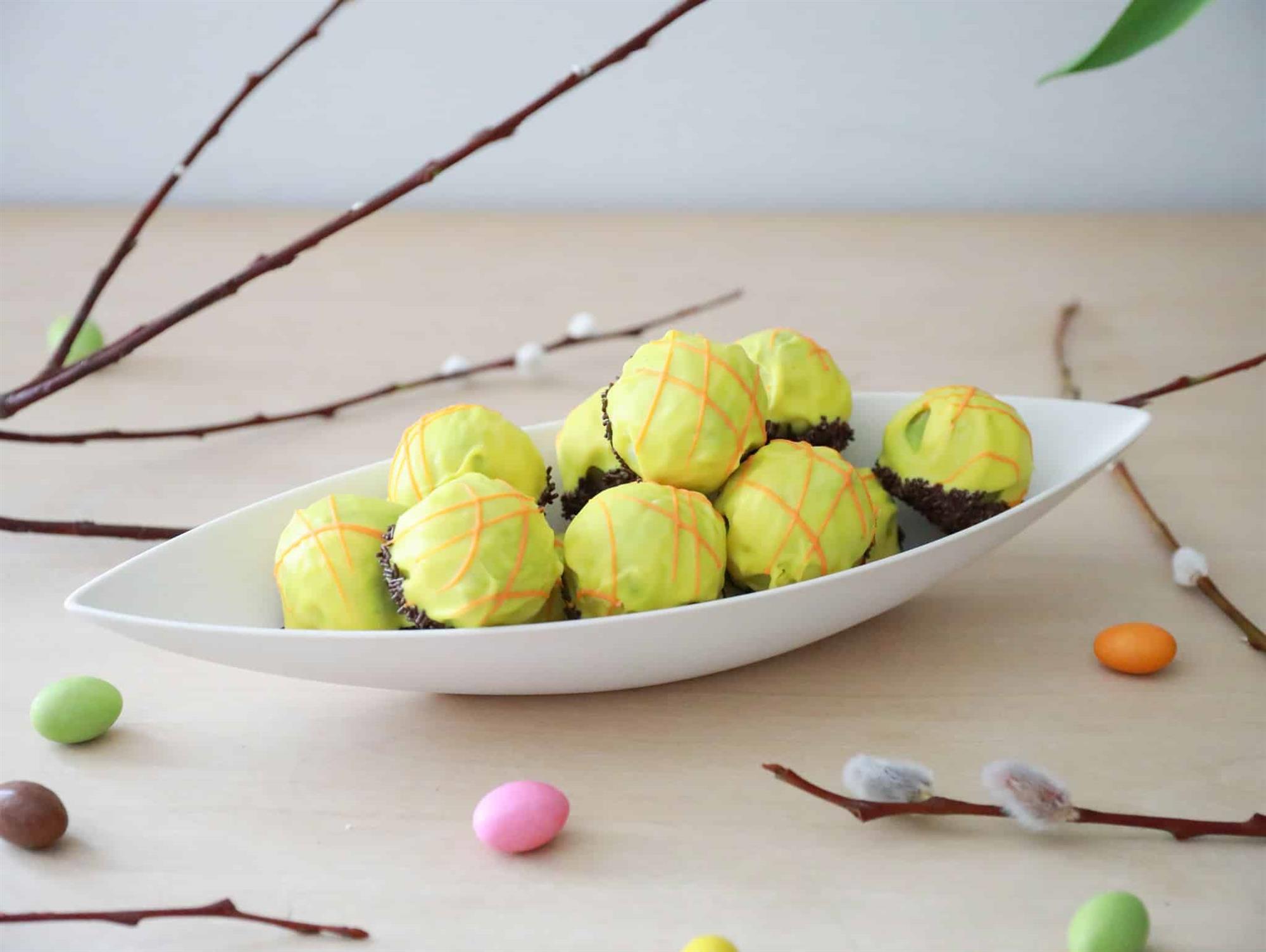 Vores passion romkugler er med fyld fra Danmarks bedste romkugle, overtrukket med hvid chokolade og passionsfrugt. Til sidst er de pyntet med orange appelsinstriber.